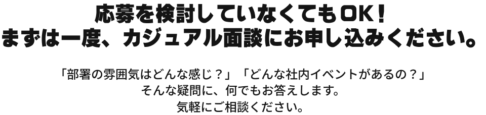 カジュアル面談→書類選考→職場見学・最終面接という流れです。入社後のミスマッチ防止のため、最終面接前に職場見学を実施しています。