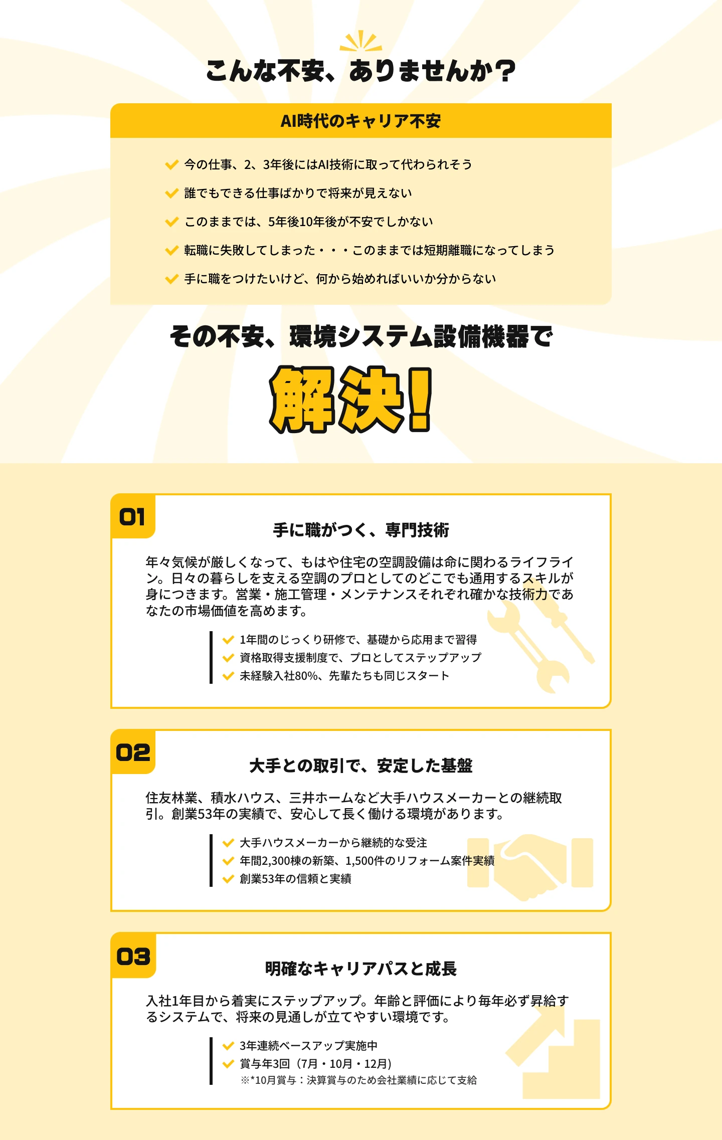 戸建て住宅に設置された空調設備の定期メンテナンスをお任せします。手に職つけたい方が未経験からスタートでき、年収UPも可能です。