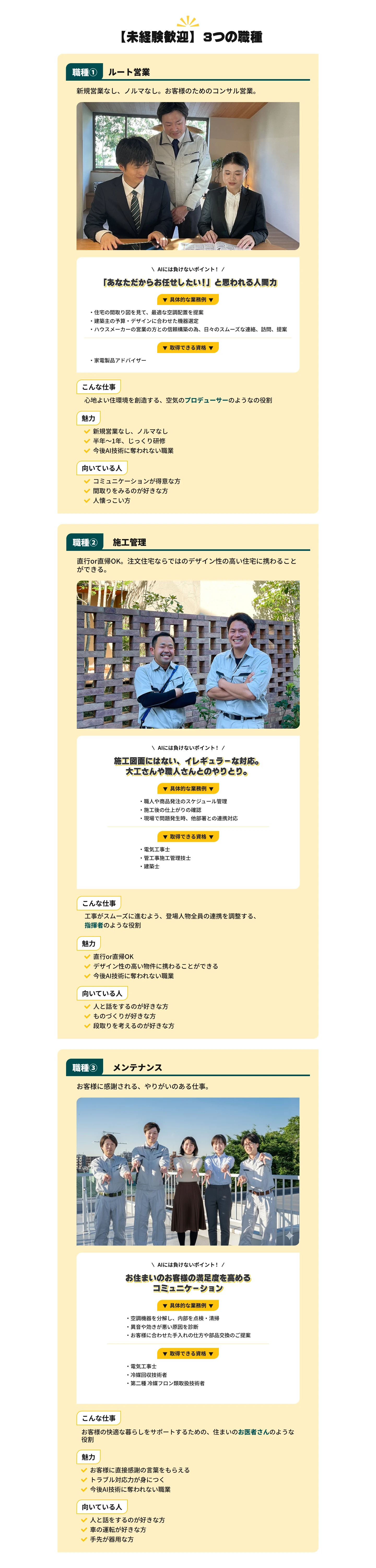 もちろん大丈夫です。当社の社員の多くが未経験からスタートしています。OJTやメーカー研修を通じて、基礎から学ぶ環境が整っています。コミュニケーションが好きで、住まいや、ものづくりに興味があれば問題ありません。
