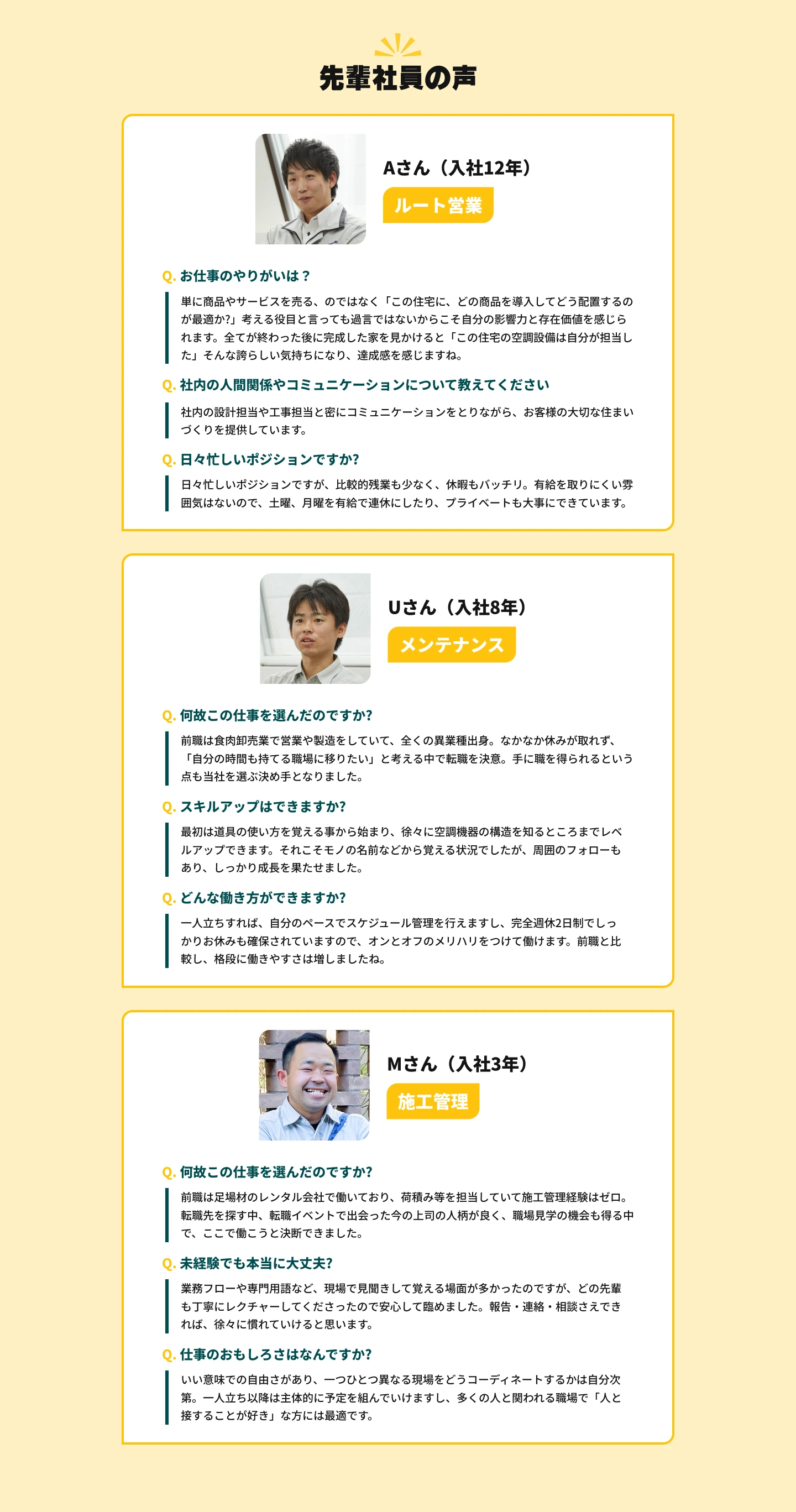 OJTで先輩とペアで勤務できるのでいつでも質問ができる環境です。現場によっては直行or直帰可能です。