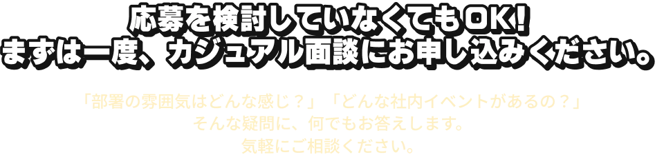 カジュアル面談→書類選考→職場見学・最終面接という流れです。入社後のミスマッチ防止のため、最終面接前に職場見学を実施しています。