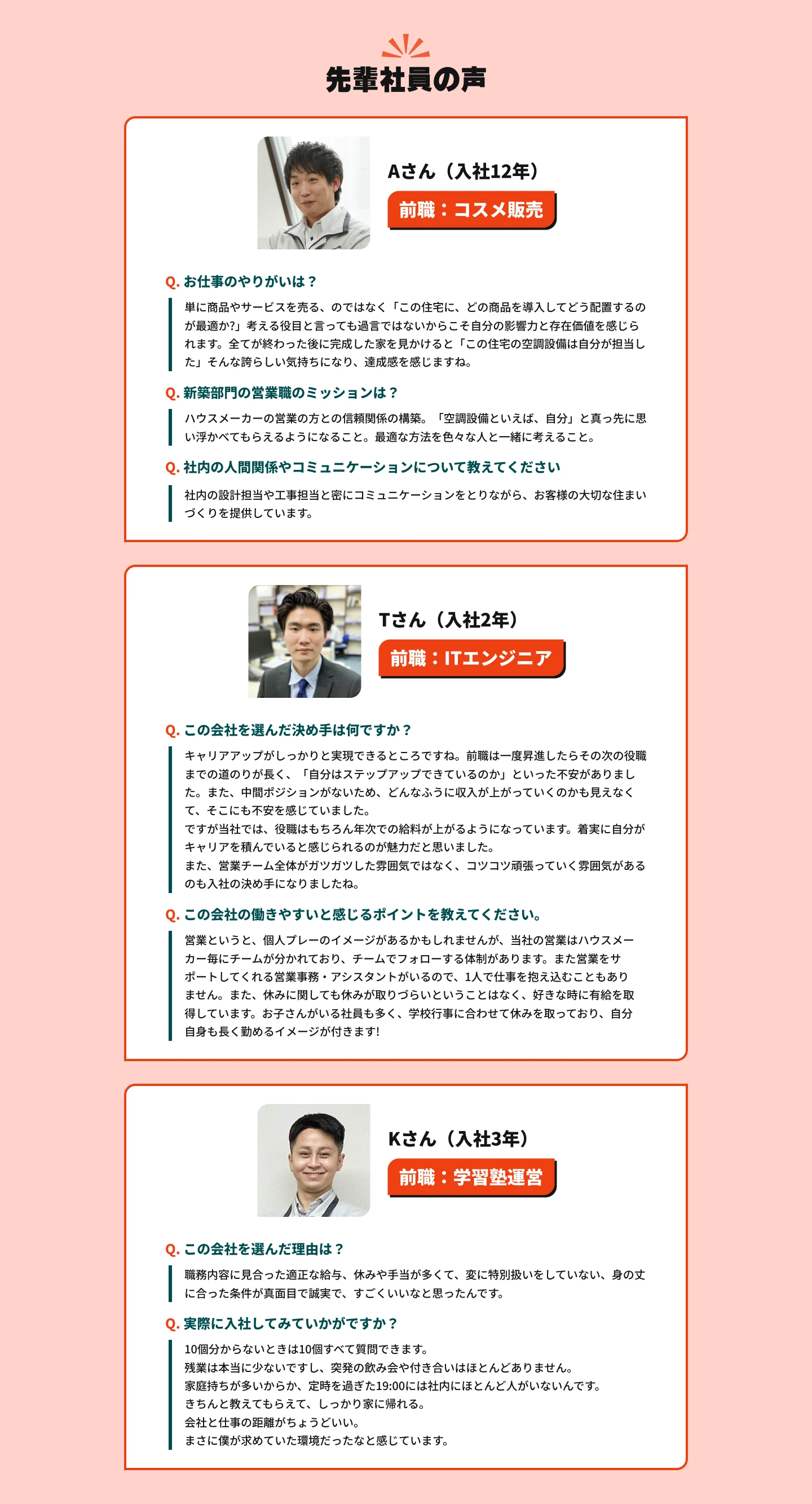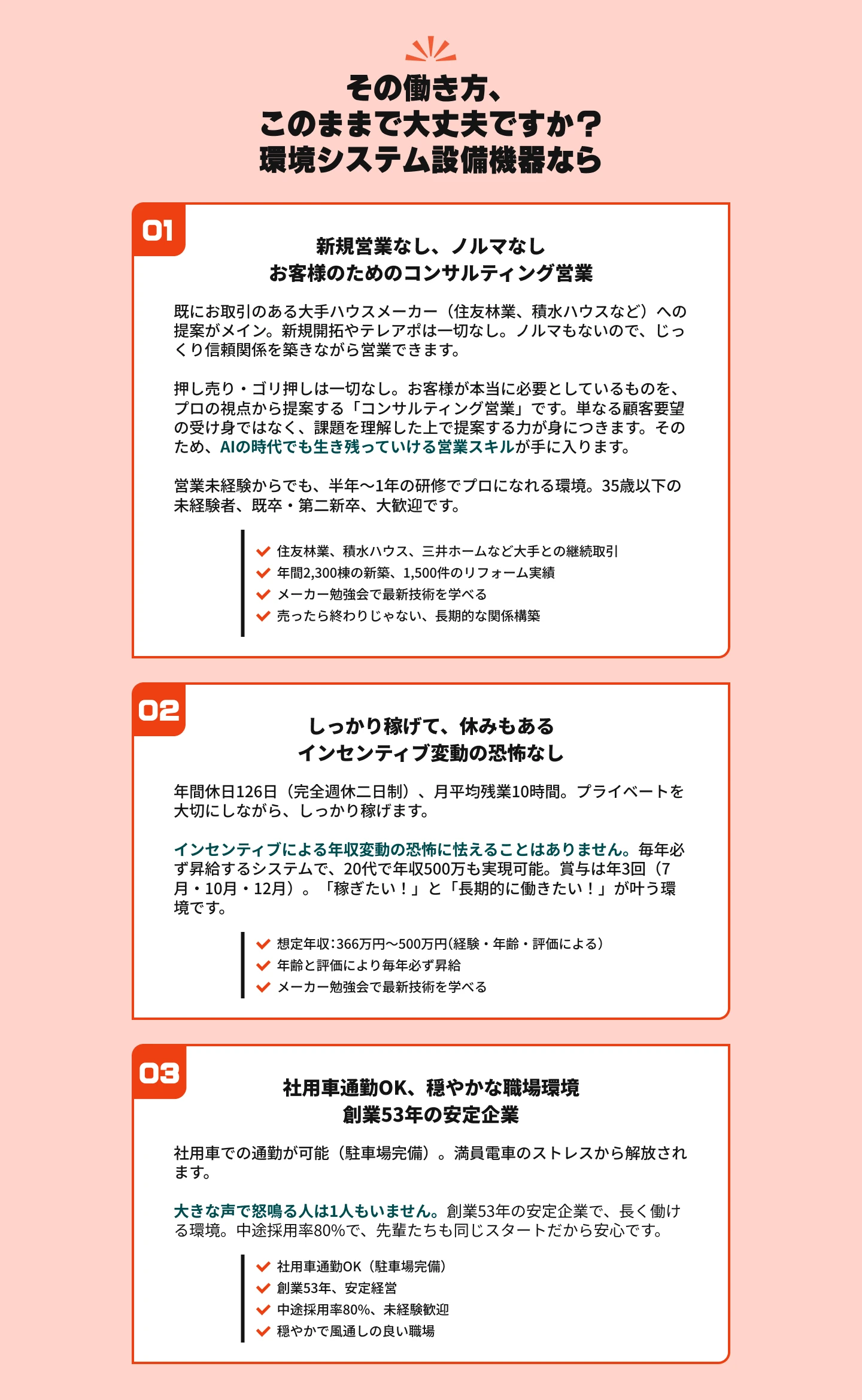個人ノルマはありません。目標はありますが、無理な数字を追いかけるのではなく、お客様との信頼関係を大切にする営業スタイルです。