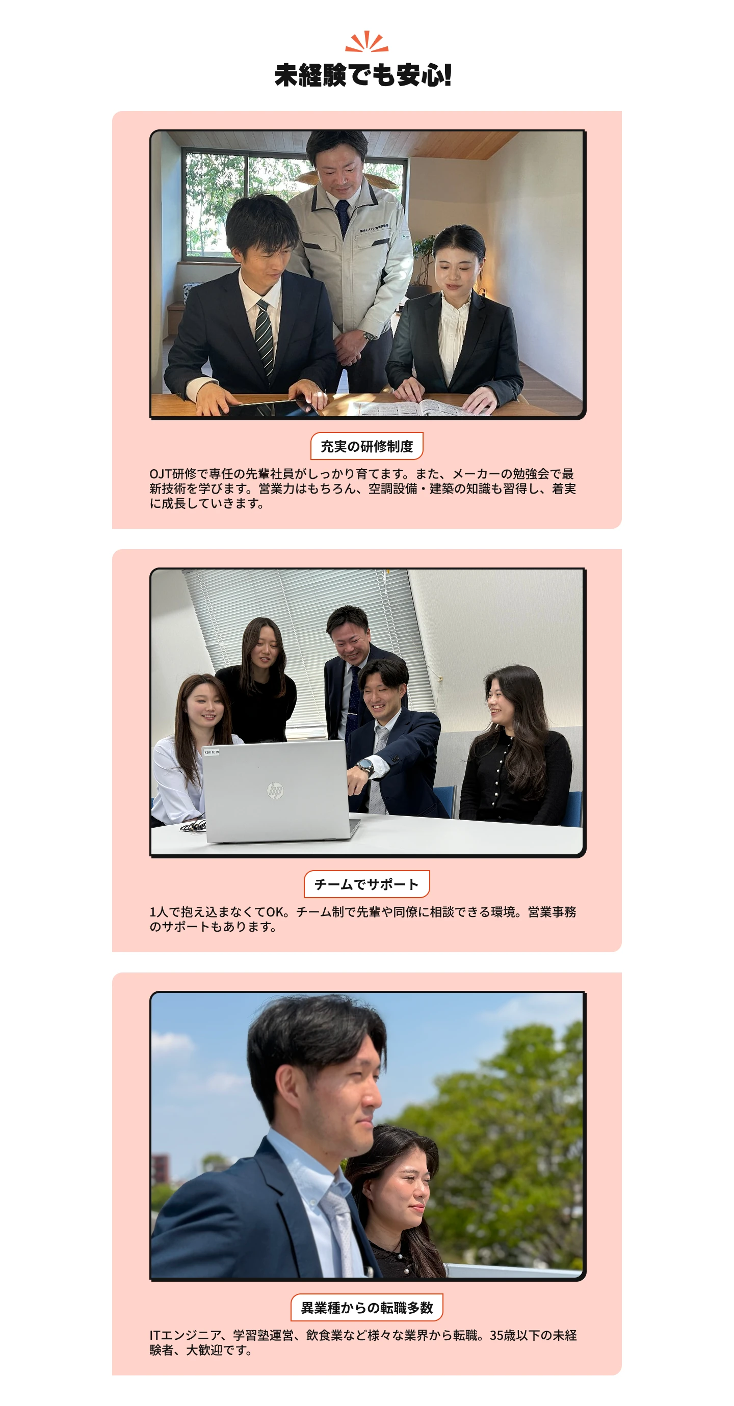 もちろん大丈夫です。当社の営業担当の多くが未経験からスタートしています。OJTやメーカー研修を通じて、基礎から学ぶ環境が整っています。コミュニケーションが好きで、住まいやインテリアに興味があれば問題ありません。